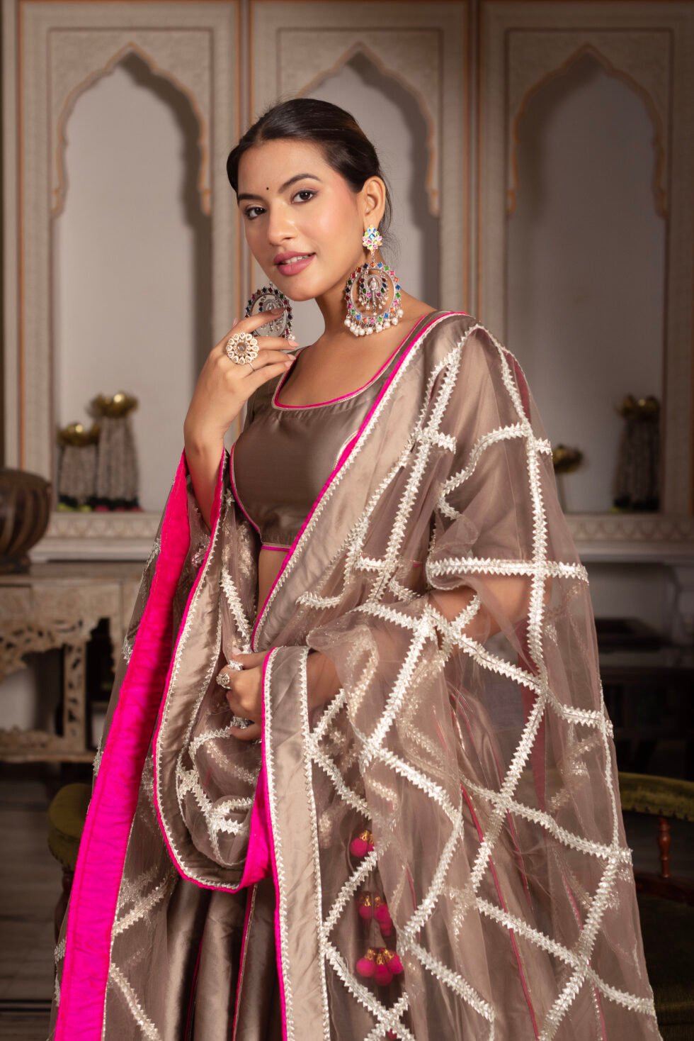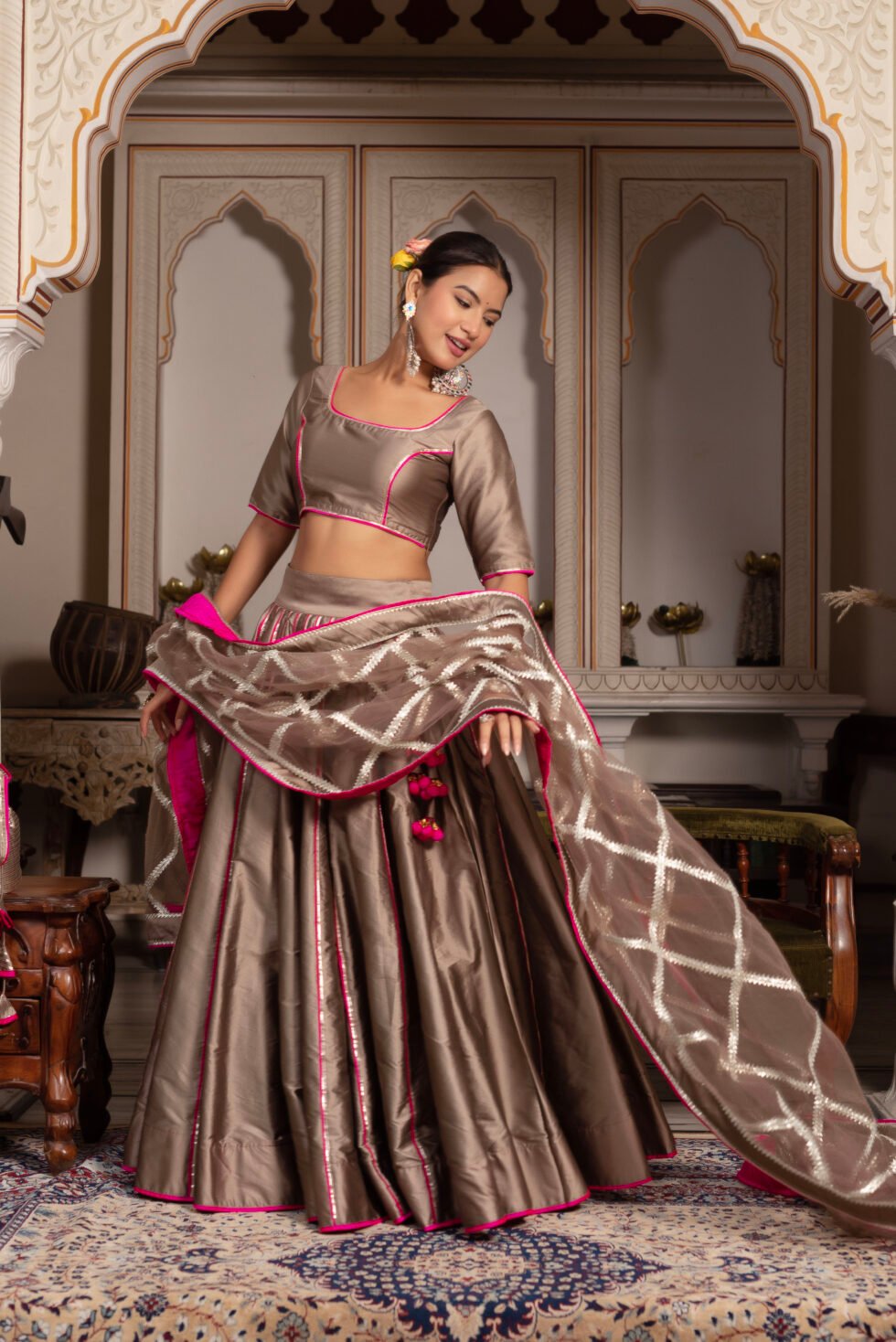 Grace meets glamour in this Ash Gold Taffeta Silk Lehenga Set, embellished with intricate gota patti work.