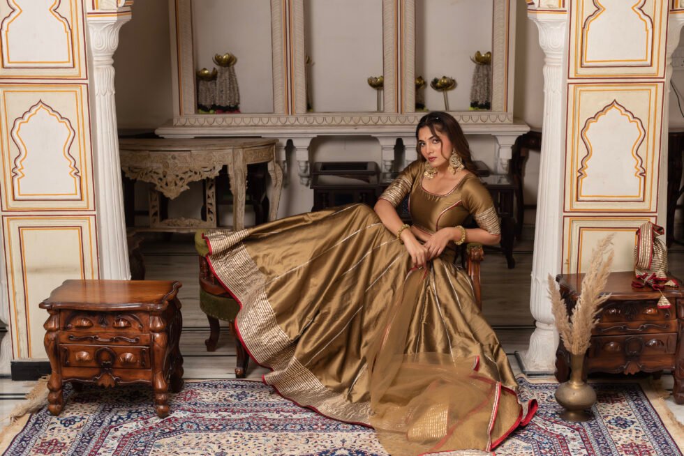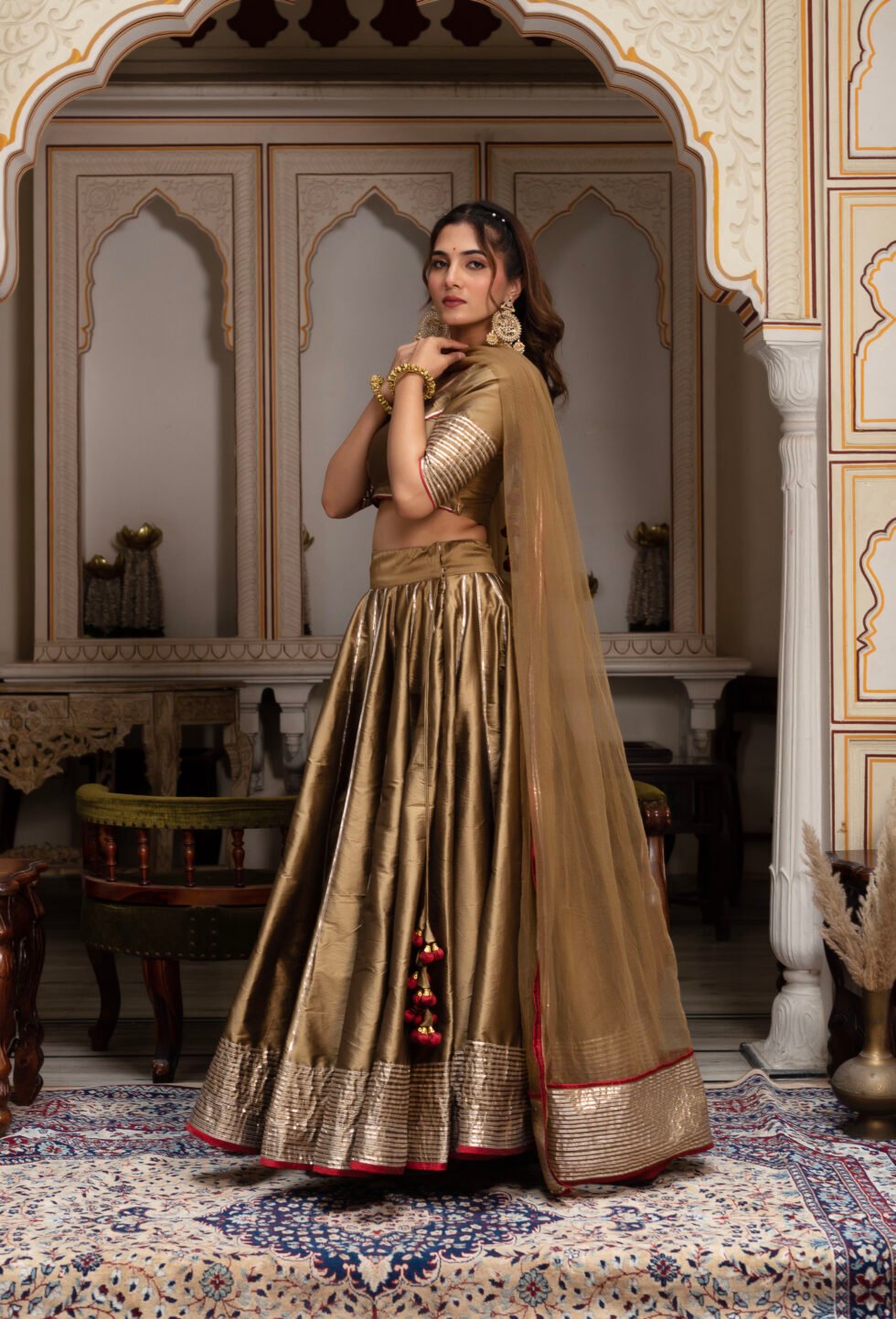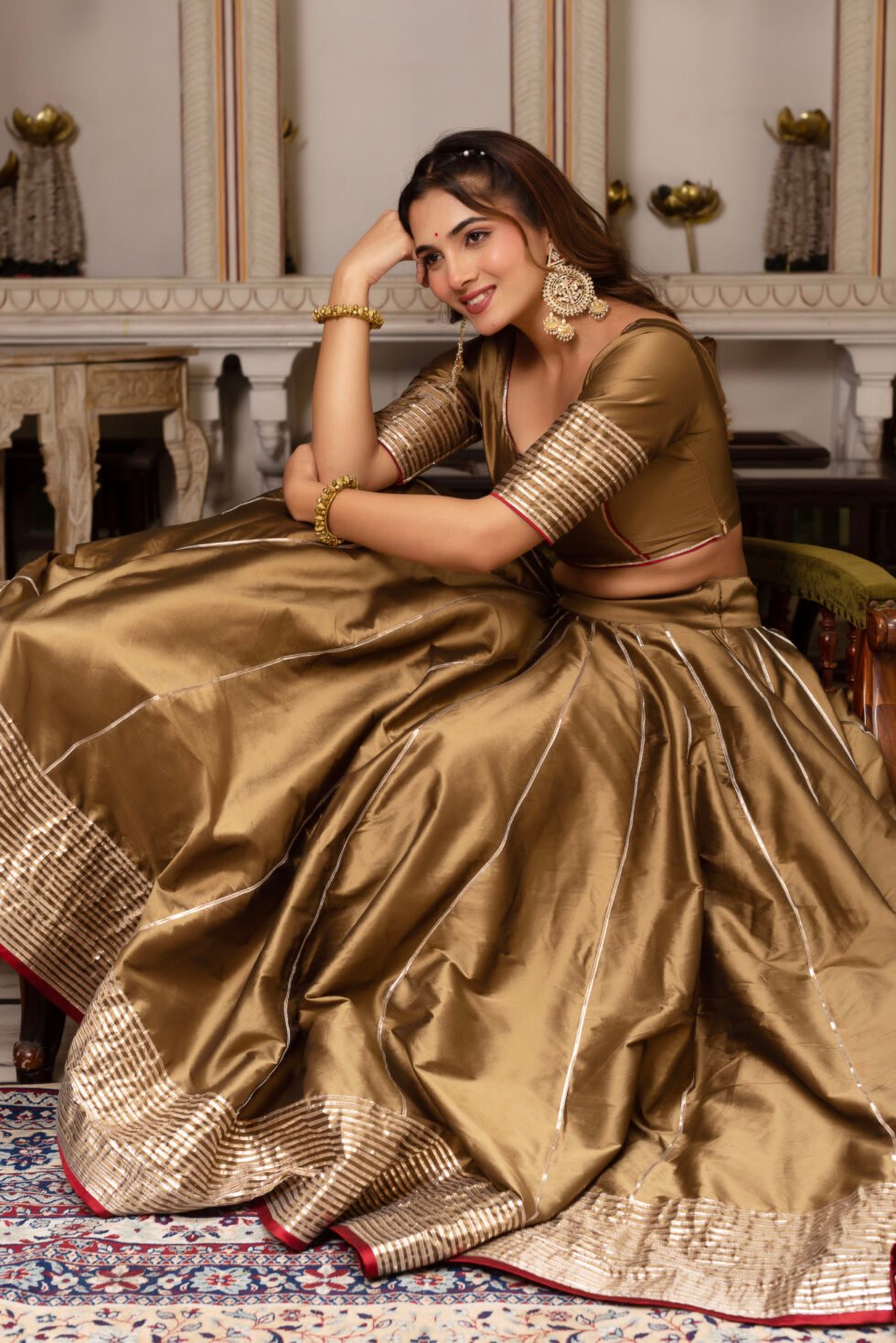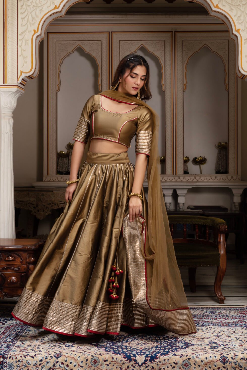 Turn heads in this graceful Dust Gold Taffeta Silk Gota Patti Lehenga Set, featuring intricate hand-done Gota Patti embroidery on rich, lustrous taffeta silk. The lehenga’s subtle gold tone adds a regal charm, perfectly complemented by a coordinated blouse and dupatta. Ideal for weddings, festive occasions, or evening celebrations, this ensemble blends traditional artistry with timeless elegance.