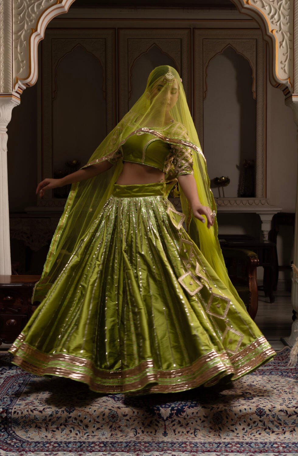 Meera Gulaal Green Gota Patti Taffets Silk Lehenga Set- Pomcha Jaipur